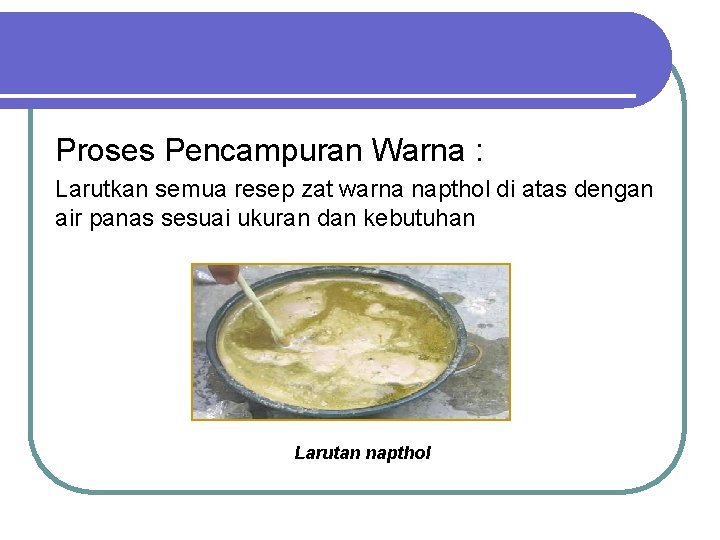 Batik Teknik Ikat Celup Dan Tempel Semprot Ppt Download from slideplayer.info Resep minuman segar es wa… read more resep warna hitam napthol : Mar 23, 2018 · zat warna napthol pada dasarnya tidak larut dalam air. Sahabat 99, hitam dan sentuhan gelap kerap dihindari oleh banyak orang ketika itu berkaitan dengan warna dapur pada rumah. Bentuk ikan koi dalam karya kombinasi batik tulis ta pdf bentuk ikan koi dalam karya kombinasi batik pdf document juni 30, 2021 resep warna hitam napthol dilarutkan dengan air sebanyak i liter. Naphtol dasar (penaphtolan) biasanya digunakan pertama kali dalam proses pewarnaan. Supaya mudah larut zat warna ini harus ditambahkan sedikit costic soda dan air mendidih, bahkan bila perlu bisa dipanaskan hingga larut sempurna (bewarna bening). Sudah diizinkan bpom lansia akan diberi vaksin covid 19 hulondalo id. Jul 01, 2021 · resep warna hitam napthol :